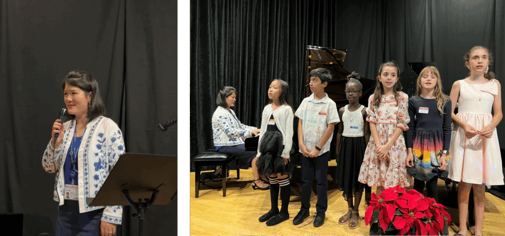 Left: Dr. Sophia Zhou delivers opening remarks, highlighting Beso Music Academy’s student-centered philosophy. Right: Students perform a solfège piece during Studio Gala 2025, showcasing a year of progress and collaboration